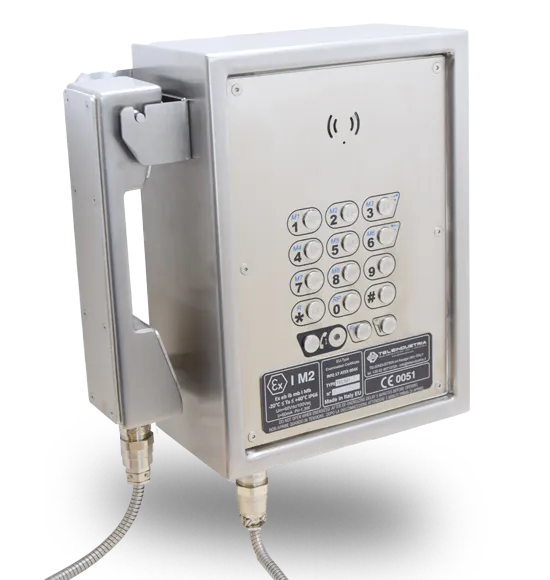 El MINERCOM® TEL501T es un teléfono analógico diseñado específicamente para minas y ambientes industriales con riesgo de explosión. Certificado bajo las normativas ATEX e IECEx, este dispositivo garantiza seguridad y fiabilidad en condiciones extremas, siendo ideal para zonas clasificadas como Grupo I M2.